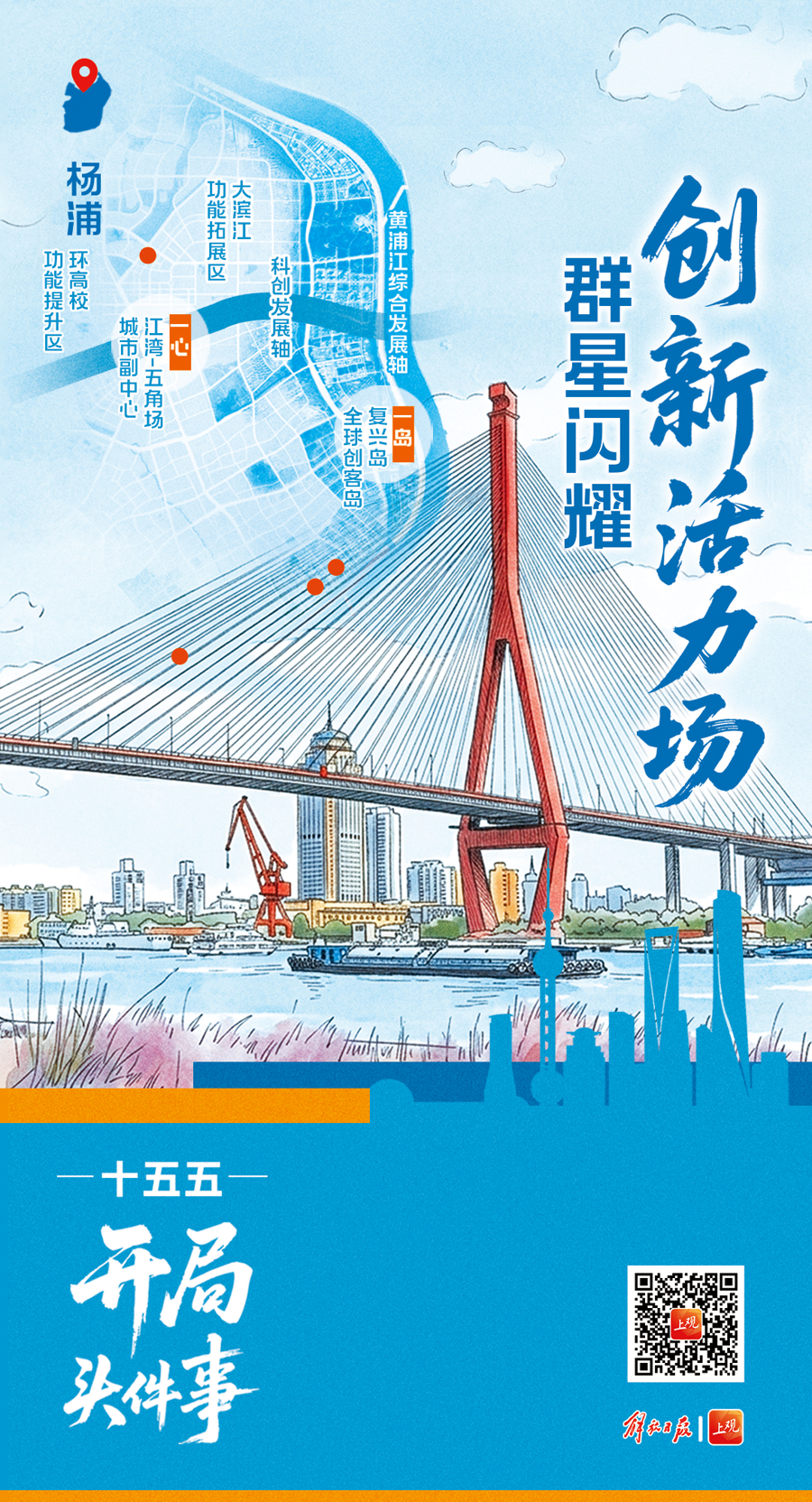 看杨浦空间布局,一个个“创新活力场”热力四射。杨浦加快建设东部大滨江功能拓展区和西部环高校功能提升区,持续提升江湾-五角场城市副中心能级,加速开展复兴岛未来城市创新实验,推动创新要素全域贯通、相互赋能。