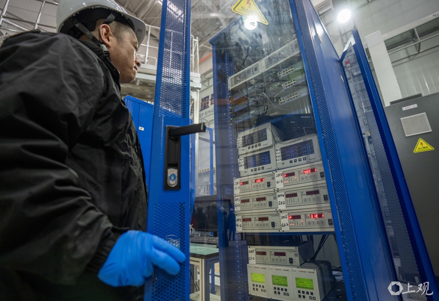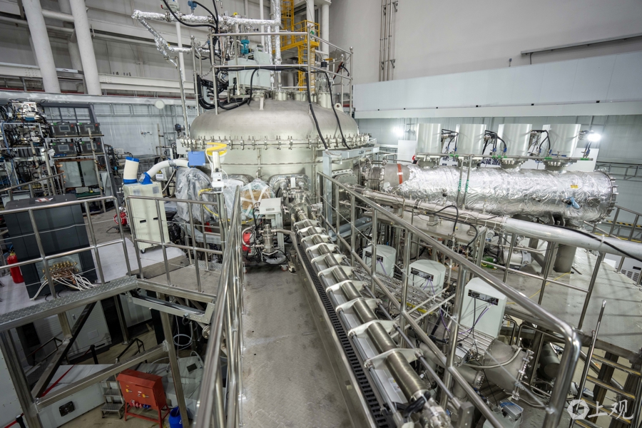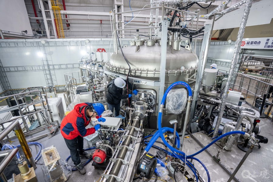 3月31日下午,工作人员对全球首台全高温超导托卡马克装置——“洪荒70”关键部件进行检查、维修工作,为下一轮实验做准备。